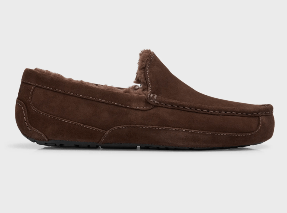 A pair of slip-on, furry-lined suede slippers are perfect for at-home lounging.