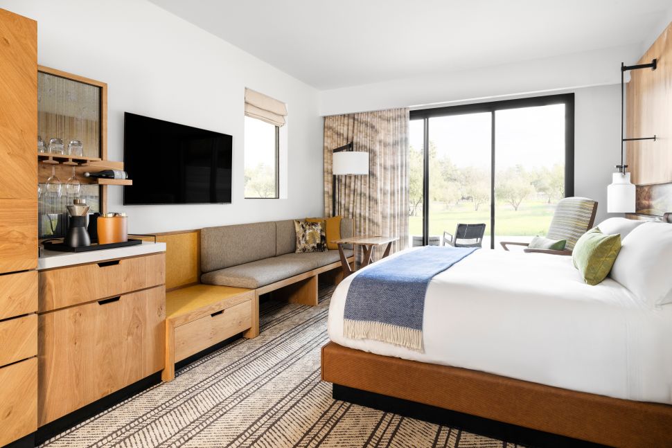 Another exciting opening near Joshua Tree, Hotel Wren is an intimate, 12-room hideaway designed by Manola Studio founder Jessica Pell. Originally a 1940s roadside motel, Hotel Wren preserves the property’s retro foundation while giving it a stylish facelift inspired by the surrounding desert landscape and the Indigenous peoples who inhabited it. A decorative attention to detail and craftsmanship extends from the cozy, fireside lobby to the chic yet inviting rooms with sandy tones, vaulted ceilings and convenient kitchenettes.